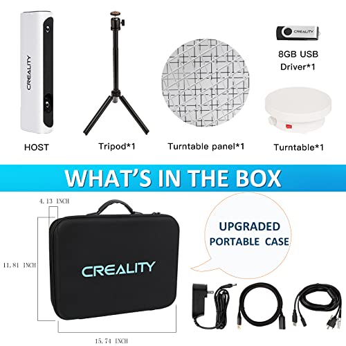- ✔️【Auto Scan Matching, Easy to Operate】Creality CR-SCAN01 3D modeling scanner adopts intelligent wide-range alignment algorithm to ensure automatic matching, there is no need to manually mesh alignments, calibrate or use marker points. For Upgraded combo, tripod and turntable can simplify the scanning process. One Click fully automatic completion of the scan, support multiple poses automatically aligned, fully automatic to get more complete model.
