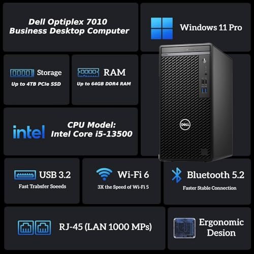 Dell 2025 Optiplex 7010 Tower Desktop, Intel Core i5-13500(Beat i7-12700), 64GB RAM, 1TB PCIe SSD + 2TB HDD, Ultra-Quiet Design, DVD-RW, Display Port, HDMI, RJ-45, Wired KB & Mouse, Windows 11 Pro