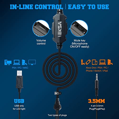 EKSA Gaming Headset with Microphone, Xbox One Headset with Noise Cancelling Mic & RGB Light - Gaming Headphones for PC, Laptop, Xbox One Controller (Adapter Not Included), PS4 - 3.5mm cable