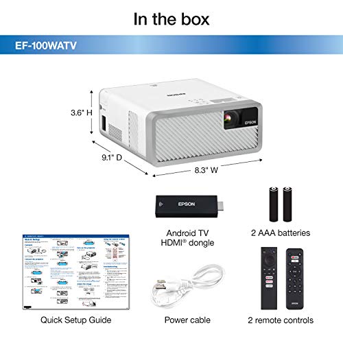 - ELEGANT COMPACT DESIGN – Designed with simplicity in mind, the Epson EF-100 has a clean, compact, and modern design available in white and silver, or black and copper to beautifully fit within any décor.