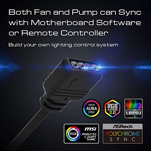 - Sync with Differnent Motherboard with One Click: The AiO RGB CPU Liquid Cooler supports motherboard sync through the mobo software with address header. ASUS AURA, GIGABYTE FUSION, MSI MYSTIC, ASROCK POLYCHROME, BIOSTAR VIVID LED DJ