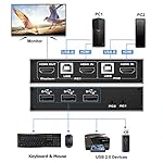 - 🖨 【EASY TO HOOK UP, PLUG&PLAY】 The USB HDMI Switch with button design, freely switch between 2 computers by pressing a button. Powered by HDMI cables, no power adapter required, plug and play, saving you space. Support wireless keyboard and mouse and mechanical gaming keyboard. (Different from power by USB, power by HDMI is easier to wake up the devices when the computer is in sleep mode, which is more convenience and save time)