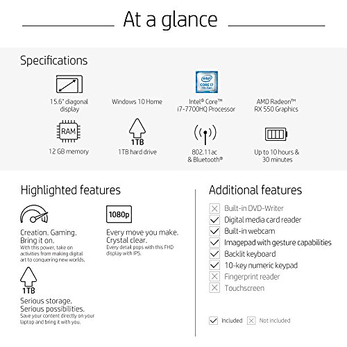 HP Pavilion Power 15-inch Laptop, Intel Core i7-7700HQ , AMD Radeon RX 550, 12GB RAM, 1TB hard drive, Windows 10 (15-cb071nr, Black), Gaming