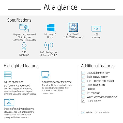 - Monitor: 10-point touch-enabled 21.5" diagonal widescreen FHD (1920x1080) IPS WLED-backlit micro-edge monitor
