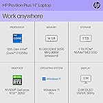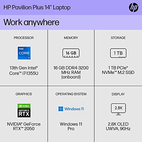 HP Pavilion Plus 14 inch Laptop, 2.8K OLED Display, 13th Generation Intel Core i7-1355U, 16 GB RAM, 1 TB SSD, NVIDIA GeForce RTX 2050 Graphics, Windows 11 Pro, 14-eh1299nr (2023)