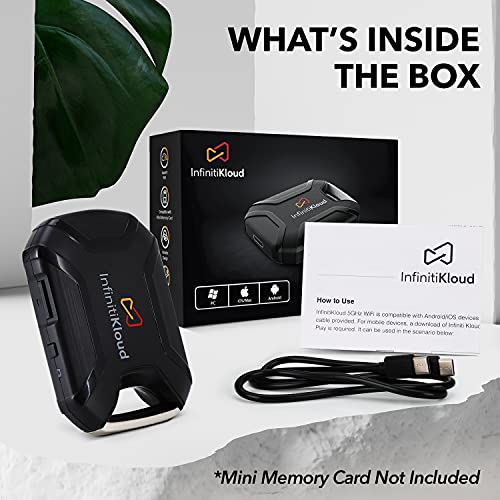 - USE APP TO SHARE, STORE BACKUP DEVICE, AND ENCRYPT FILES - InfinitiKloud App and mini memory card acts like an external wireless hard drives to share, store and even add a layer of data protection with AES 256-Bit Encryption. Drag and drop important files, organize documents, WiFi password protection, and backup your media on your memory hard drive card (sold separately), all from the InfinitiKloud app! The expandable flash drive external storage for cards that keep your memories secure.