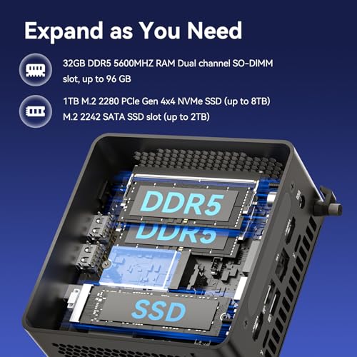 - 【Memory & Storage: Flexible & High-Performance】Equipped with 32GB RAM, the device supports DDR5 RAM up to 96GB for expanded multitasking power. For storage, it features two M.2 slots: one M.2 2280 slot comes preinstalled with a 2TB SSD, while the M.2 2280 slot supports up to 8TB SSD and the M.2 2242 slot up to 2TB SSD. This ensures fast data access and ample storage for multitasking and large datasets.