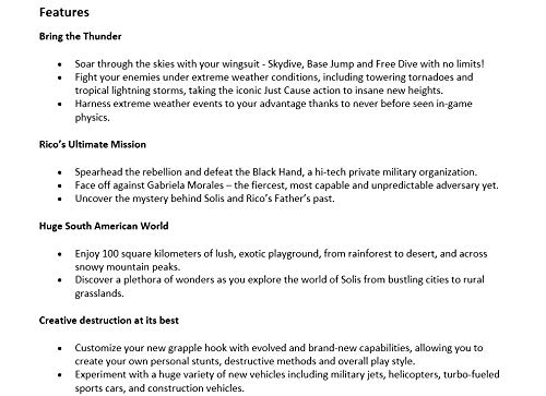 - Rico’s Ultimate Mission Spearhead the rebellion and defeat a hi tech private military organization; Face off against the most capable adversary yet; Uncover the mystery behind Rico’s Father’s past