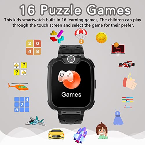 Kids Smart Watch for Boys Girls - HD Touch Screen Sports Smart Watch for 4-12 Years Kids Watches with Camera 16 Learning Games Recorder Alarm Music Player for Children Teen Students (Black)