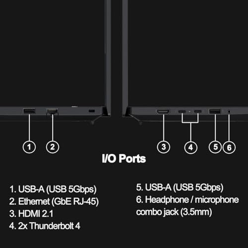 - RICH CONNECTIVITY OPTIONS — Stay connected with versatile ports, including 2 x Thunderbolt 4, 2 x USB 3.2 Gen 1, HDMI 2.1, Ethernet (RJ45), and a headphone/mic combo. Enjoy blazing-fast wireless speeds with Intel Wi-Fi 6E and seamless device pairing via Bluetooth 5.3. Enhance security and convenience with a built-in Fingerprint Reader, and work comfortably in any lighting with a Backlit Keyboard.