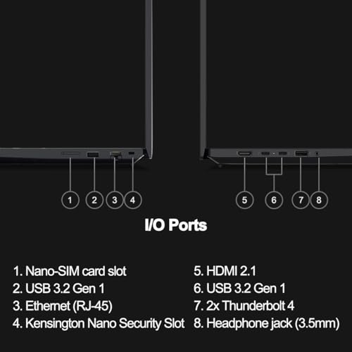 - RICH CONNECTIVITY OPTIONS — Stay connected with versatile ports, including 2 x Thunderbolt 4, 2 x USB 3.2 Gen 1, HDMI 2.1, Ethernet (RJ45), Nano-SIM Card Slot, and a Headphone/mic combo. Enjoy blazing-fast wireless speeds with Intel Wi-Fi 6E and seamless device pairing via Bluetooth 5.3. Enhance security and convenience with a built-in Fingerprint Reader, and work comfortably in any lighting with a Backlit Keyboard.
