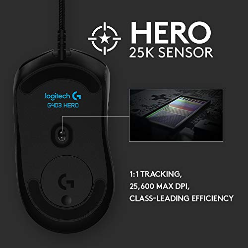 Logitech G403 Hero 25K Gaming Mouse, Lightsync RGB, Lightweight 87G+10G optional, Braided Cable, 25, 600 DPI, Rubber Side Grips