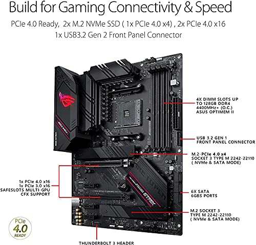 - ASUS ROG Strix B550-F ATX Gaming Motherboard. AMD AM4 Socket and PCIe 4. 0. The perfect pairing for Zen 3 Ryzen 5000 & 3rd Gen AMD Ryzen CPUs. Supports HDMI 2. 1(4K@60HZ) and DisplayPort 1. 2 output, featuring dual M. 2 slots (NVMe SSD)- one with PCIe 4. 0 x4 connectivity, USB 3. 2 Gen 2 Type-C port and Thunderbolt 3 header