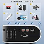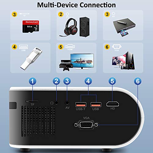 - 【PORTABLE VERSATILE DIGITAL PROJECTOR】:Compatible with HDMI, AV, VGA, SD Card port, which allows you to use it with Laptop, PCs, TV Box, TV Stick, ChromeBook, Tablets, Blue-ray DVD player, SD Card, USB Flash Drive.