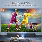 - 🌐【5G & 2.4G WiFi Screen Mirroring】 5G and 2.4G mirroring modes. 5G bandwidth can be increased to 40MHz or even 80MHz, and the transmission speed is up to 1Gbps, which can transmit about 125MB content per second. You can instantly mirror the movies on your phone to the projector in one second with no extra adapters and dongles. NOTE: Due to copyright issues Netflix / Amazon are prohibited from playing movies. You can connect the projector with the TV Stick to watch Netflix or other videos.