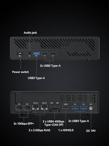 - 【Ultra Fast Connectivity】:Micro PC MS-01 is equipped with two 10Gbps SFP+ Ethernet ports. The SFP+ module provides high stability and fiber-optic transmission to prevent eavesdropping and interception, ensuring network security. The 10Gbps transmission speed is 10 times that of traditional 1000Mbps Ethernet, which meets the needs of high-performance network devices. In addition, to the two SFP+ network ports, the MS-01 is equipped with two standard 2.5Gbps RJ45 network ports, which deliver twice the transfer speed of a single 2.5Gbps port for improved network performance.
