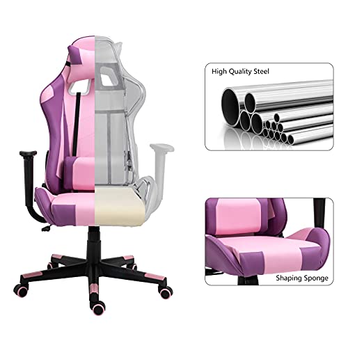 Modern-Depo Gaming Chair with Headrest and Lumbar Support, Height Adjustable Swivel Office Chair High-Back Recliner, Purple Pink
