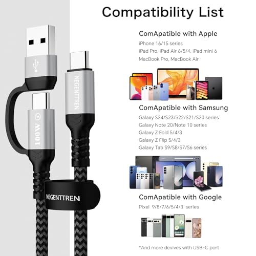 NEGENTTREN 2 in 1 USB C to C Cable 100W (6FT, 2Pack), 5A Fast Charging Type A to C Charger Cord Nylon Braided USB C Cable for iPhone 16 Max Series, MacBook Pro, iPad (100W Cable)