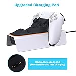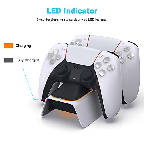 - 【Aesthetic Match】 The design of this charging dock was created to perfectly match the look and feel of the PS5. The lights glow the same orange hue as the controllers and the white/black scheme allows it to sit next to the PS5 comfortably.