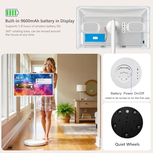 - 【Integrated 9600mAh Battery for Extended Mobility】Touchscreen tv is equipped with a built-in 9600mAh high-capacity battery located on the rear panel. A dedicated power switch is provided for user convenience. Prior to the first use, the power valve must be activated. The battery supports continuous wireless operation for approximately 5–8 hours, making it ideal for mobile entertainment, streaming, and music playback on the go.