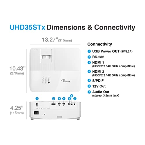 - SHORT THROW FOR FLEXIBLE SETUP: The UHD35STx is designed to be placed closer to the wall than standard throw projectors. Project a 100” image from just over three feet away and create an immersive experience in just about any space