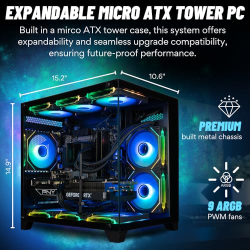 - [FANS] 9 ARGB PWM Fans for Powerful Air Flow and Dynamic Speed Control | [PC CASE] Panorama with Front and Side Full Panel Tempered Glass For Panoramic View | No Bloatware | Graphic output options include 1x HDMI and 1x DisplayPort Guaranteed, additional ports may vary | Free Rainbow Backlit USB Keyboard and LED USB mouse