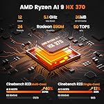 - 【2025 Latest Upgrade - Unmatched AI Performance】 The HO5 Mini PC wiht an AMD Ryzen AI 9 HX 370 processor, built on the cutting-edge "Strix Point" architecture. This chip delivers an industry-leading 80 TOPS of total AI acceleration, featuring a next-gen XDNA 2 AI engine that pumps out 50 TOPS of dedicated NPU performance, enabling seamless Copilot+ experiences, local large model deployment, and advanced content generation. HO5 Mini Pc impressive speeds of up to 5.1GHz, ensuring smooth multitasking and fast performance. With a peak power consumption of 54W, it balances power and efficiency.