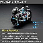- PENTAX SHAKE REDUCTION MECHANISM - Equipped with the PENTAX SR II, the K-3 Mark III provides up-to 5.5-Shutter-Step image stabilization on 5-Axis' for blur-free images when using telephoto lenses or challenging low-light. The Pentax Shake Ruduction Mechanism is comptible with every Pentax lens ever manufactured and is also used for other photo applications such as [ Pixel Shift Resolution, AstroTracer, HDR, Image Composistion, AA-Filter Simulator ]