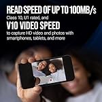 - Class 10, U1, V10 speed class performance with read speeds up to 100MB/s* for continuous HD photography and full HD videography