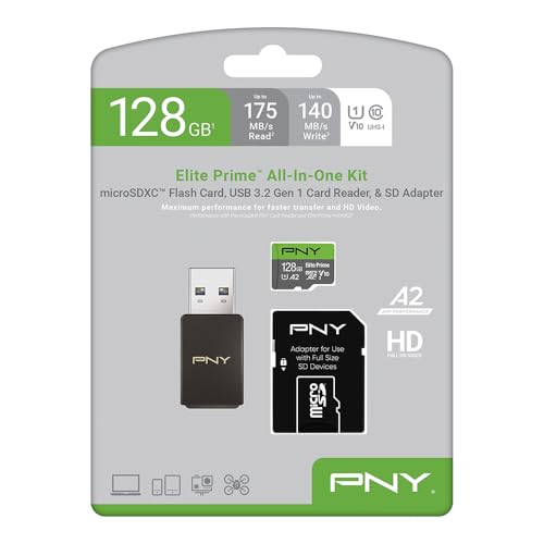 PNY 128GB Elite Prime Class 10 U1 V10 A2 microSDXC Flash Memory Card & USB 3.2 Gen 1 Card Reader - 175MB/s, Class 10, U1, V10, A2, Full HD, UHS-I, Micro SD