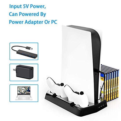 - 【Dual Sense Charging Station】 There are 2 PS5 controller charger stations on the charging dock. In this case, you can conveniently put the 2 controller and the game in this PS5 console cooling fan device together while charging them at the same time as well.