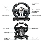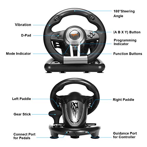 - 【PC DUAL ANALOG STEERING WHEEL】: PC dual-mode drive for playing computer racing, free switching between the two modes, with linear foot pedals to support automatic endurance, throttle lock value; steering wheel with 180° rotation, with rubber texture coating wheel handles, Equipped with sports car-style paddles, manual gear shifting, imitating the ergonomic design of racing wheels.