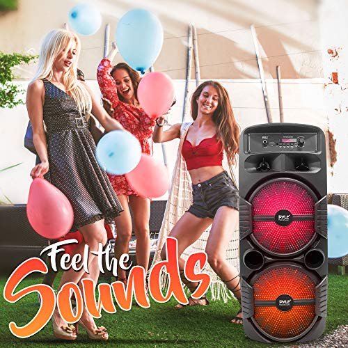 Pyle Portable Bluetooth PA Speaker System - 600W Rechargeable Outdoor Bluetooth Speaker Portable PA System w/ Dual 8” Subwoofer 1” Tweeter, Microphone In, Party Lights, USB, Radio, Remote - PPHP2835B
