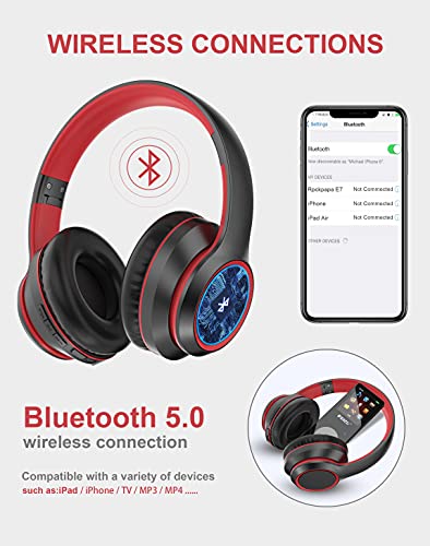 Rockpapa E8 Wireless Over Ear Headset with Deep Bass, Bluetooth and Wired Foldable Headphones Built-in Mic for Cell Phone, TV, Tablets, PC, Include Travel Case, Black Red
