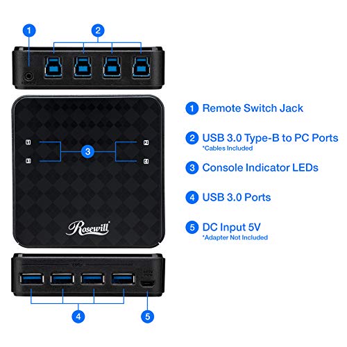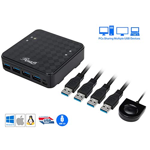 Rosewill USB 3.0 Sharing Switch Box, 4 Port USB 3.0 Peripheral Switch Hub Adapter for 4 Computers to Share USB Devices, PC Select Controller w/ 70” Cable, 4 USB 3.0 Cables Included - RCUS-17004