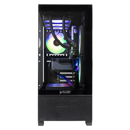 - High-spec AIO liquid coolers used, delivering unmatched cooling performance for a perfect operational experience and unparalleled cooling performance. With hardware unrestricted by temperature limits, you can unleash its full potential. Whether gaming, creating, or working, you'll never suffer from thermal throttling again. | Skytech Azure Gaming Case with Tempered Glass, Black | 1 Year Warranty on Parts and Labor | Free Technical Support | Assembled in the USA