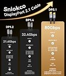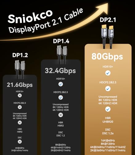 - DisplayPort 2.1 Cable for 80Gbps Ultra-Fast Gaming: Sniokco DisplayPort Cable 2.1 supports blazing-fast 80Gbps bandwidth, nearly double that of DP 2.0 and 3 times higher than DP 1.4. Designed for competitive gaming, it supports FreeSync, G-Sync, VRR, and ALLM, ensuring no lag and ultra-low latency in FPS, MOBA, and 3A titles. Fully supports HDR, HDCP 2.3, DTS 7.1, Dolby, and eARC, . Backward compatible with DisplayPort 1.4 and 1.2.