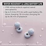 - Up to 5.5 hours of battery life and up to 17.5 hours with charging case. Quick charging gives up to 90 minutes of playback with a 10 minute charge.