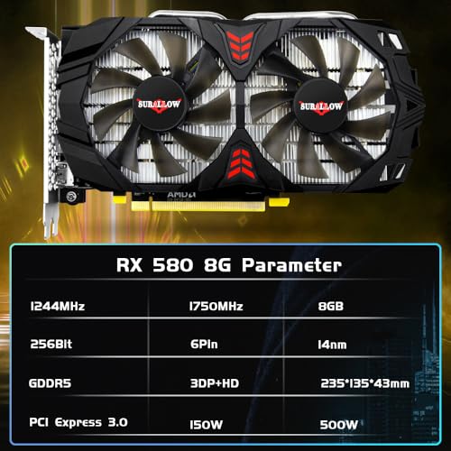 SURALLOW RX 580 Graphics Card 8GB 2048SP, GDDR5, 256 Bit, Pc Gaming Video Card, 3*DP, HDMI, PCI Express 3.0 with Freeze Fan Stop for Desktop Computer GPU for Gaming PC