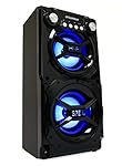- huge stereo sound with 2 x 4-inch hi-fi speakers, treble, bass, volume controls + blue led light around the speakers