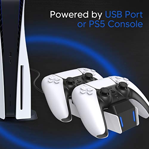 - POWERED BY CONSOLE OR USB: PS5 charger station can be powered by plugging directly into the PS5 console or with any standard USB port from a wall charger, laptop or portable power source