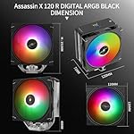 - [Product Specifications] Model: Assassin X 120 R Digital ARGB BLACK, Size: 120x71x151mm, Heat Sink Material: Aluminum, Fan Size: 120x120x25mm, Fan Speed: 2000RPM+10%, Wind Pressure: 2.63MM H2O, Air Volume: 70.84CFM, Operating Noise ≤ 29.8db (A), Fan Interface: 4PIN PWM, Main Body adopts symmetrical all aluminum fins, Combined with PWM fan, it can bring a larger heat dissipation area