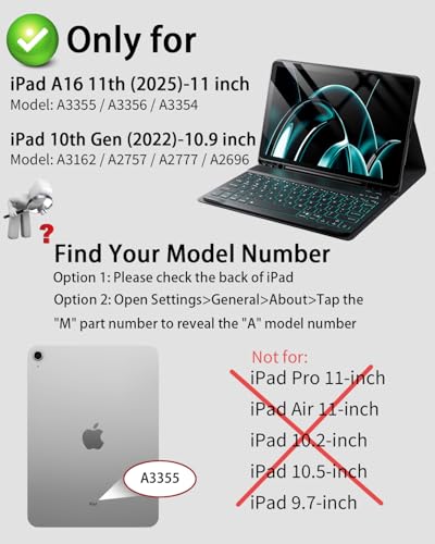 - ⌨【Model Compatibility】Designed Only for iPad 11th Gen 2025 & iPad 10th Gen 2022 10.9-11 inch, Not compatible with other models. For iPad (A16) 11th generation 11-inch 2025 (Model: A3354/A3355/A3356), For iPad 10th generation 10.9-inch 2022 (Model: A2696/A2757/A2777).You can check the model number before purchasing to make sure you get the correct size tablet keyboard case.