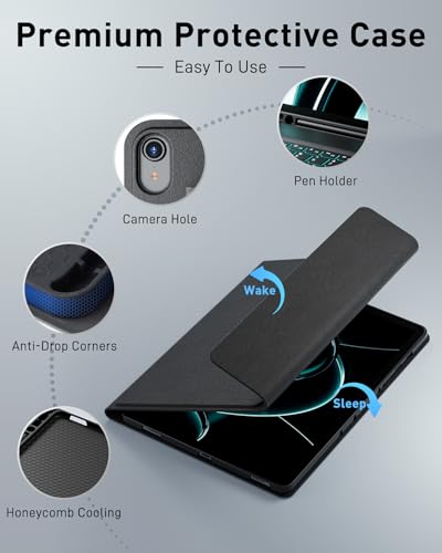 - ⌨【Adjustable Viewing Angles and Support for Pen】Case supports 3 viewing angles and has anti-slip slots. Move the tablet forward or backward along the case to choose a suitable angle to use the tablet for writing, viewing, reading, drawing, etc. Built-in Pen holder makes it easy to carry the Pen with your device. (Note: Pen not included ! ).