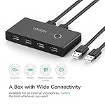 - 2 in 4 Out USB Switch Box: UGREEN 4 port USB sharing switch allows one button swapping between 2 computers to share 4 USB 2.0 peripheral devices without constantly swapping cables or setting up complicated network sharing software.