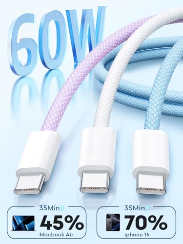 - 3-Pack Multi-Color Design: Express your personal style with three premium USB-C to USB-C cables in white, blue, and purple. Perfect for home, office, and travel use while keeping your devices organized and easily identifiable