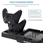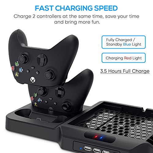 - Multi-Functionl Charging Dock: Charging stand for your game console compatible with Xbox Series X/S and controller, built in 2 cooling fans, charging dock for controllers, 3 USB hubs to expand the USB function, game storage rack for your game cards. Great way to organize and charge your gaming system at the same time. The best game experience is with this charging dock.