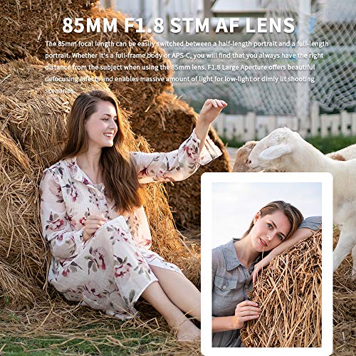 - 【85MM F1.8 STM AF LENS】The 85mm focal length can be easily switched between a half-length portrait and a full-length portrait. Whether it's a full-frame body or APS-C, you will find that you always have the right distance from the subject when using the 85mm lens. F1.8 Large Aperture offers beautiful defocusing effects and enables massive amount of light for low-light or dimly lit shooting scenarios.