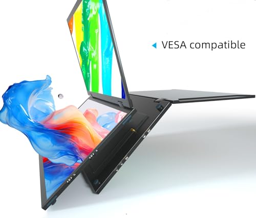 - 💻[VESA& KICKSTAND] Virzen triple screen dual portable monitor is equipped with a VESA 180° adjustable kickstand integrated design to make this portable monitor super convenient. It becomes the ideal business travel companion for laptops and phones as a second or dual screen to maximize work efficiency and simplicity. Each screen of this laptop monitor extender supports 0-360°rotation, making it easy to share the screen with your colleagues and friends in all directions in simpler way.