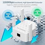 - 1200Mbps High Speed: This internet extender wifi booster uses the latest dual-band frequency technology(300Mbps/2.4GHz, 860Mbps/5GHz), providing a stable wifi speed of up to 1,200Mbps, which allows you to enjoy web browsing, gaming or video streaming under high speed internet.